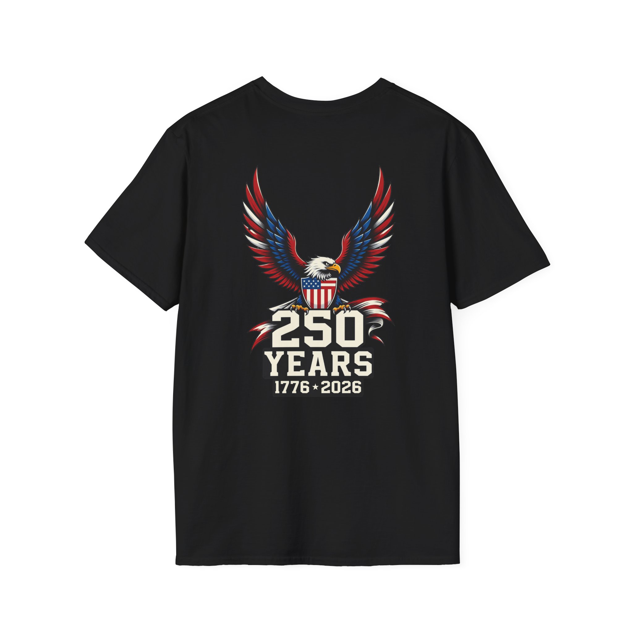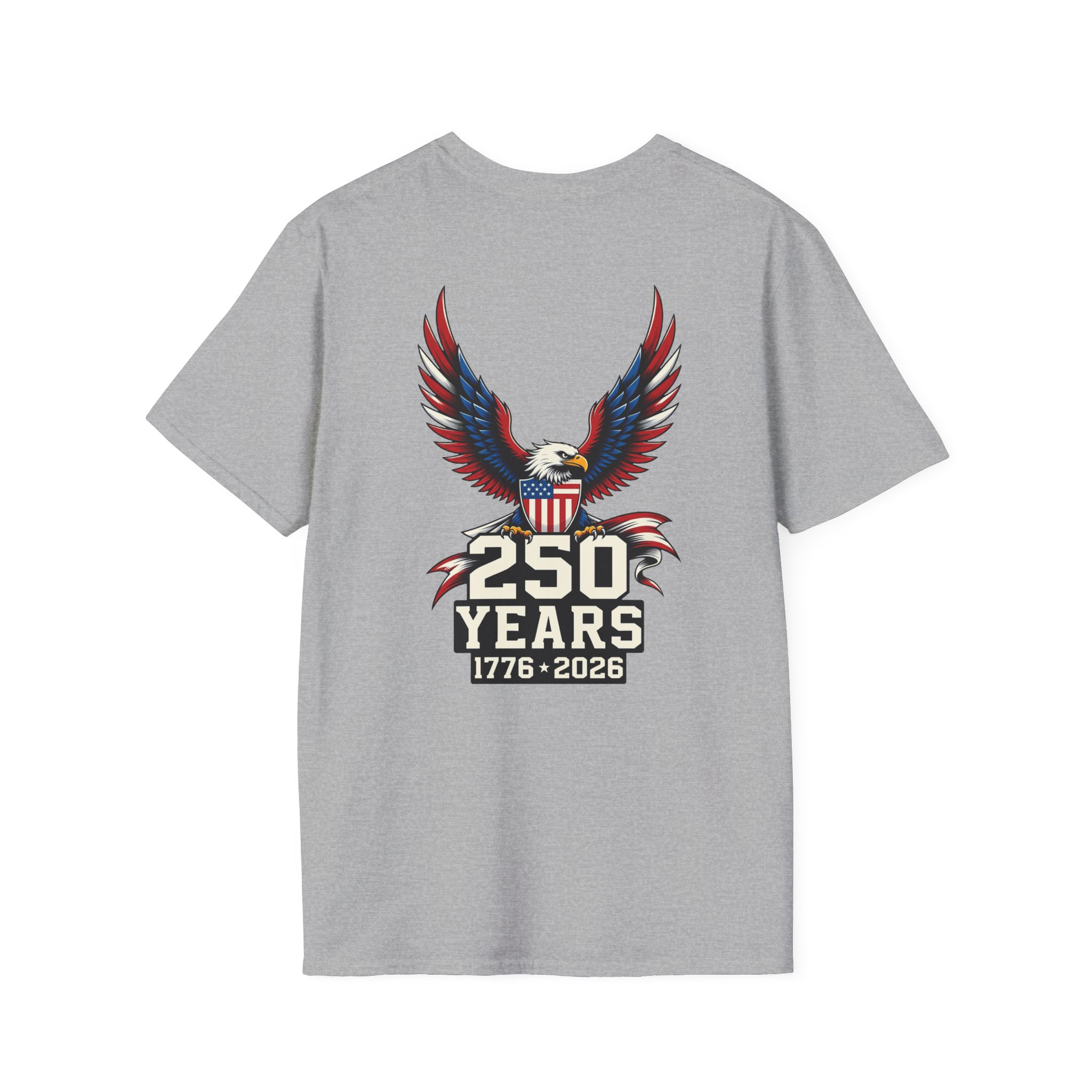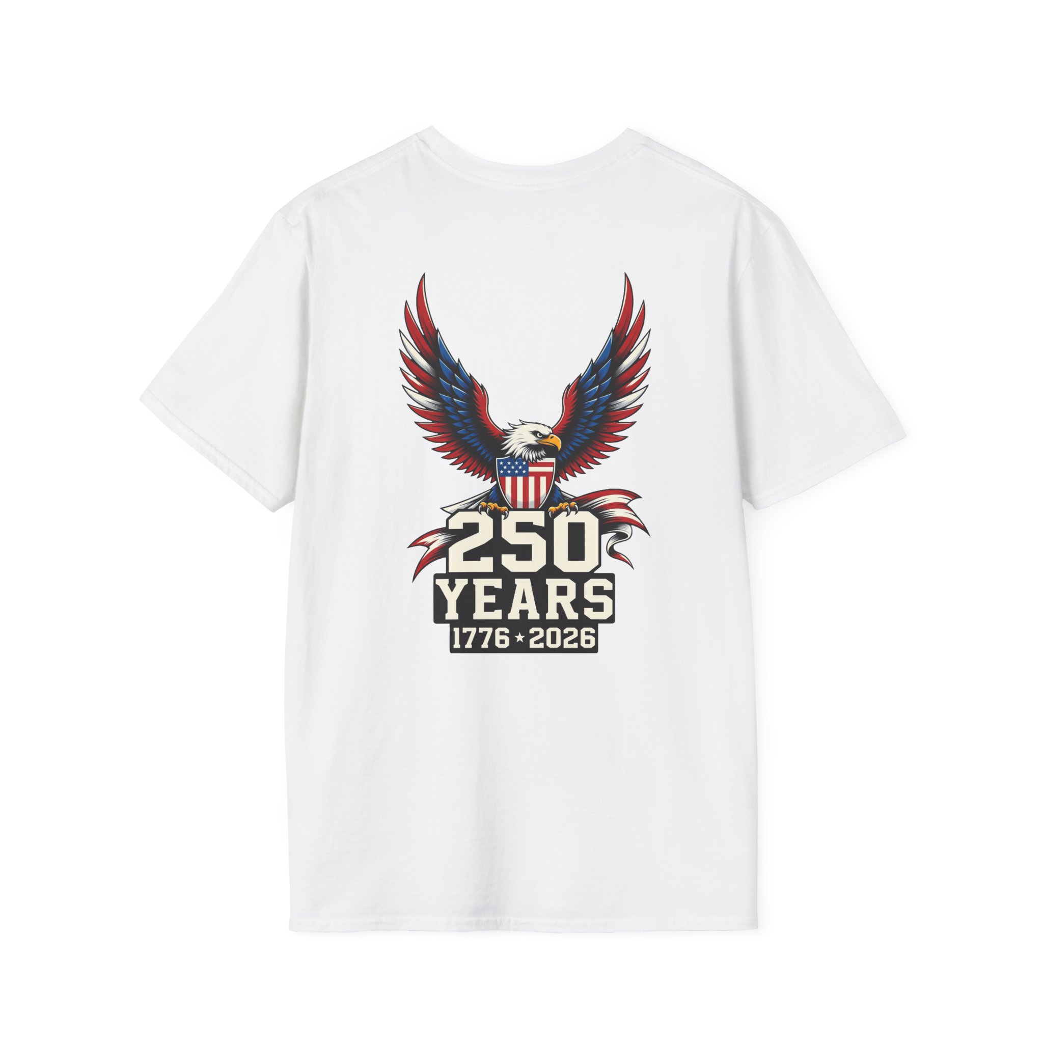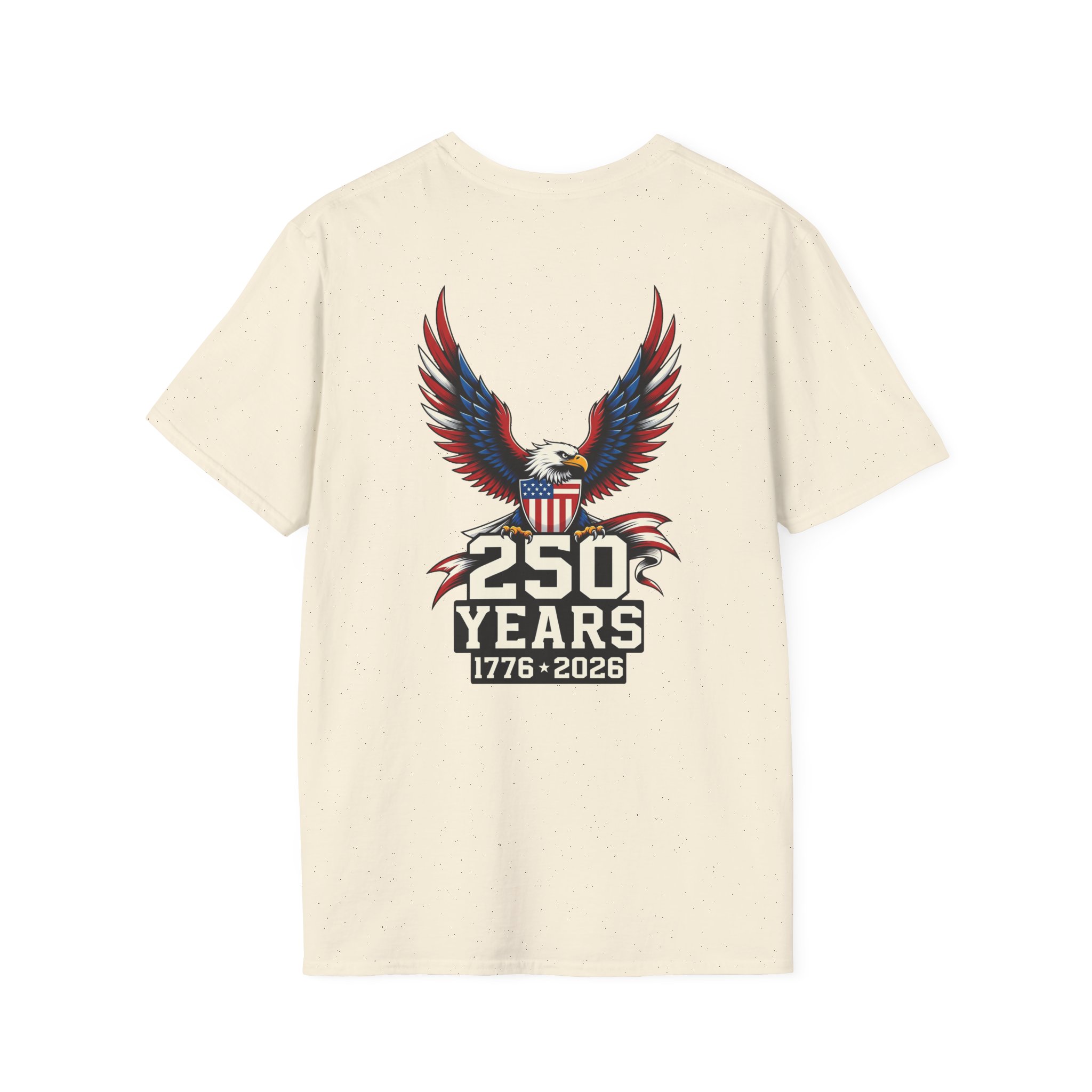 Celebrate 250 years of independence with a shirt that speaks to quiet pride and Americana grit. The front holds a subtle logo while a bold bald eagle soars across the back, wings spread in a graphic salute to history. The lightweight cotton sits softly on the skin during long summer parades and backyard gatherings. Wear it to watch fireworks from a stoop, trade stories at a neighborhood cookout, or carry forward a family tradition of remembering the day. The design leans on classic patriotic imagery without shouting, so it blends easily with denim, field jackets, or a simple cap. It’s made to be worn, washed, and worn again — each wear adding a little more memory to the fabric.